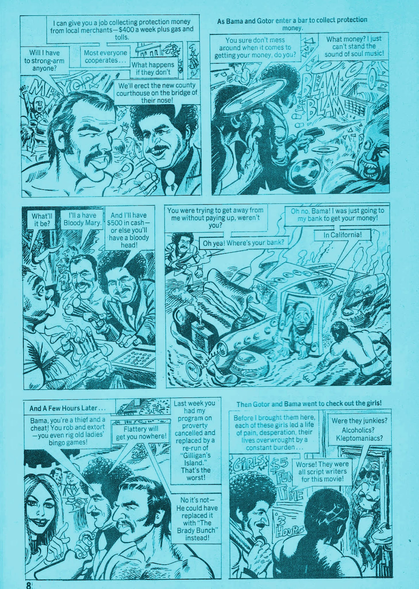 Gator is now living in the swamp with his daughter and father. Initially he eludes the law but agrees to cooperate under the threat of losing his family. He meets Bama, who looks more like Gabe Kaplan here, at a rally for the governor's challenger.