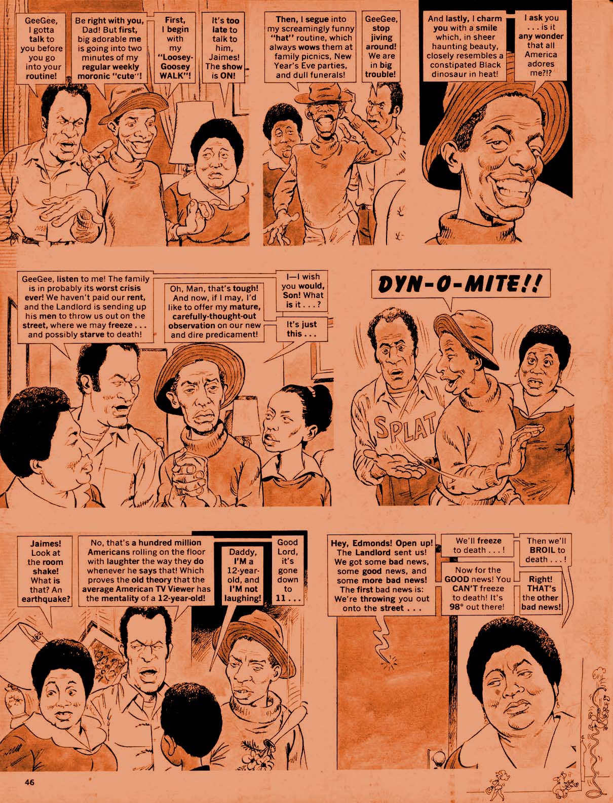 This was Cracked's second parody of the show. They often parodied shows more than once when they went through cast changes. Esther Rolle temporarily left because the program focused too much on Jimmie Walker and his saying "Dy-No-Mite" all the time, and strayed from their original premise of a family trying to make ends meet. Wilona was the one to take care of the children in the parents' absence. Janet Jackson was Penny, Wilona's adopted daughter. Johnny Brown was Bookman, superintendent of the building who started out as a supporting character but became a regular over time. Thelma cooked for the family, jokes were often at her expense about the quality. The salesman is Bill Cosby and the undercover cop is Robert Blake as Baretta. Both actor are still around and have stellar reputations. From If Frankenstein's Monster Did Guest Appearances on TV, also by Nostrand, in the next issue. GROSS TIMES