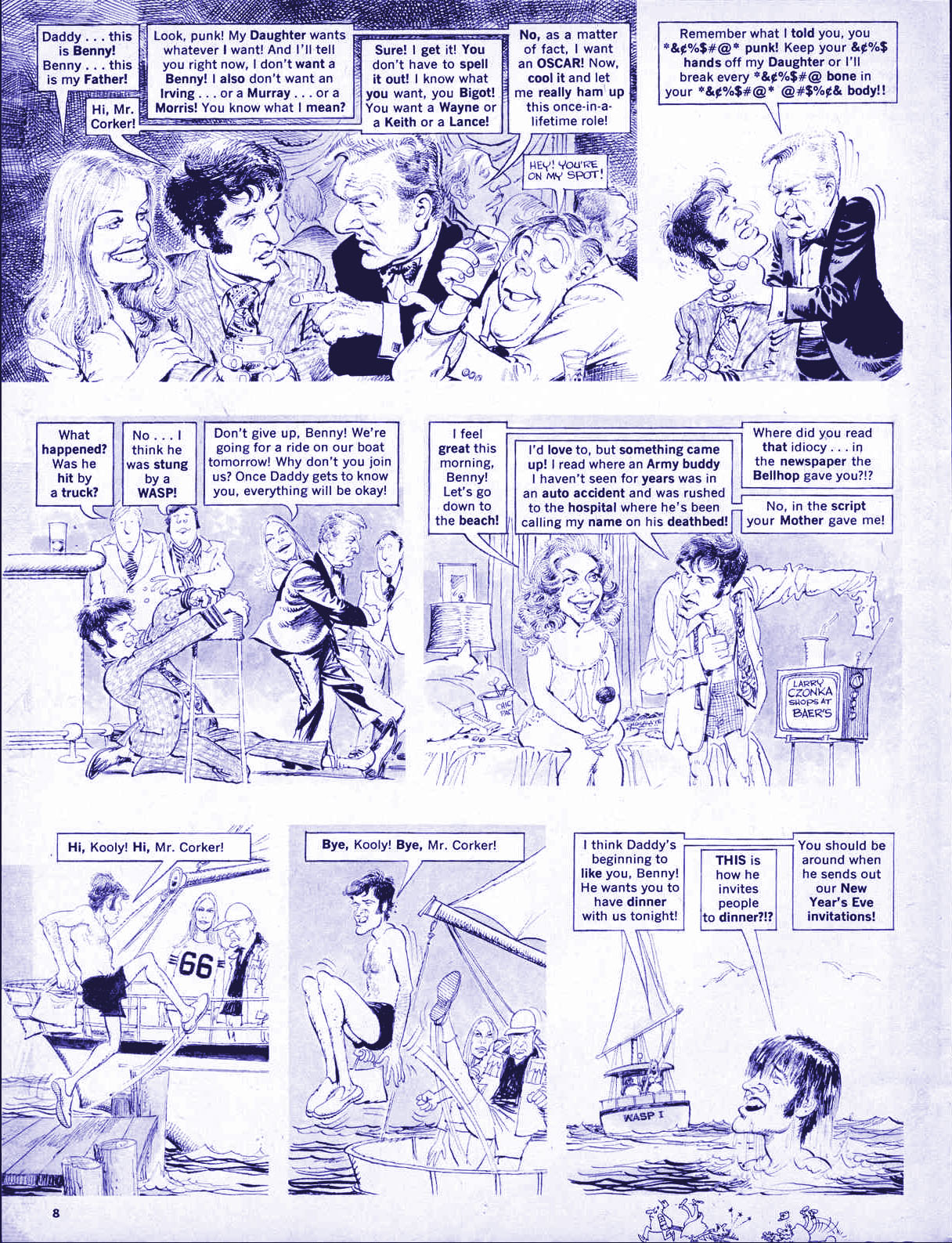 Lenny has dinner with the Corcorans and the father still hates him. Mr. Corcoran brings Lenny to his den after dinner and tells him he sees through his talk about how Midwesterners are down-to-earth and will pay him off to leave them alone. He refuses the money in the real version, but in this version the punchline is he marries into the Corleone family from The Godfather. Pictured in the last panel are Marlon Brando, Morgana King, Talia Shire, James Caan, John Cazale, Robert Duvall, and Al Pacino.