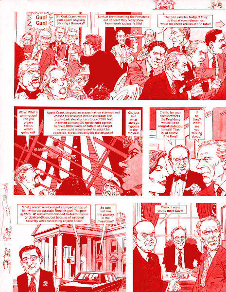 Frank has a standoff with Mitch in a glass elevator at the hotel. Ends up killing him, and becomes a hero. The last panel refers to Dave, a movie that year with Kevin Kline about the White House covering up for a President in poor health by using some who looks just like him.